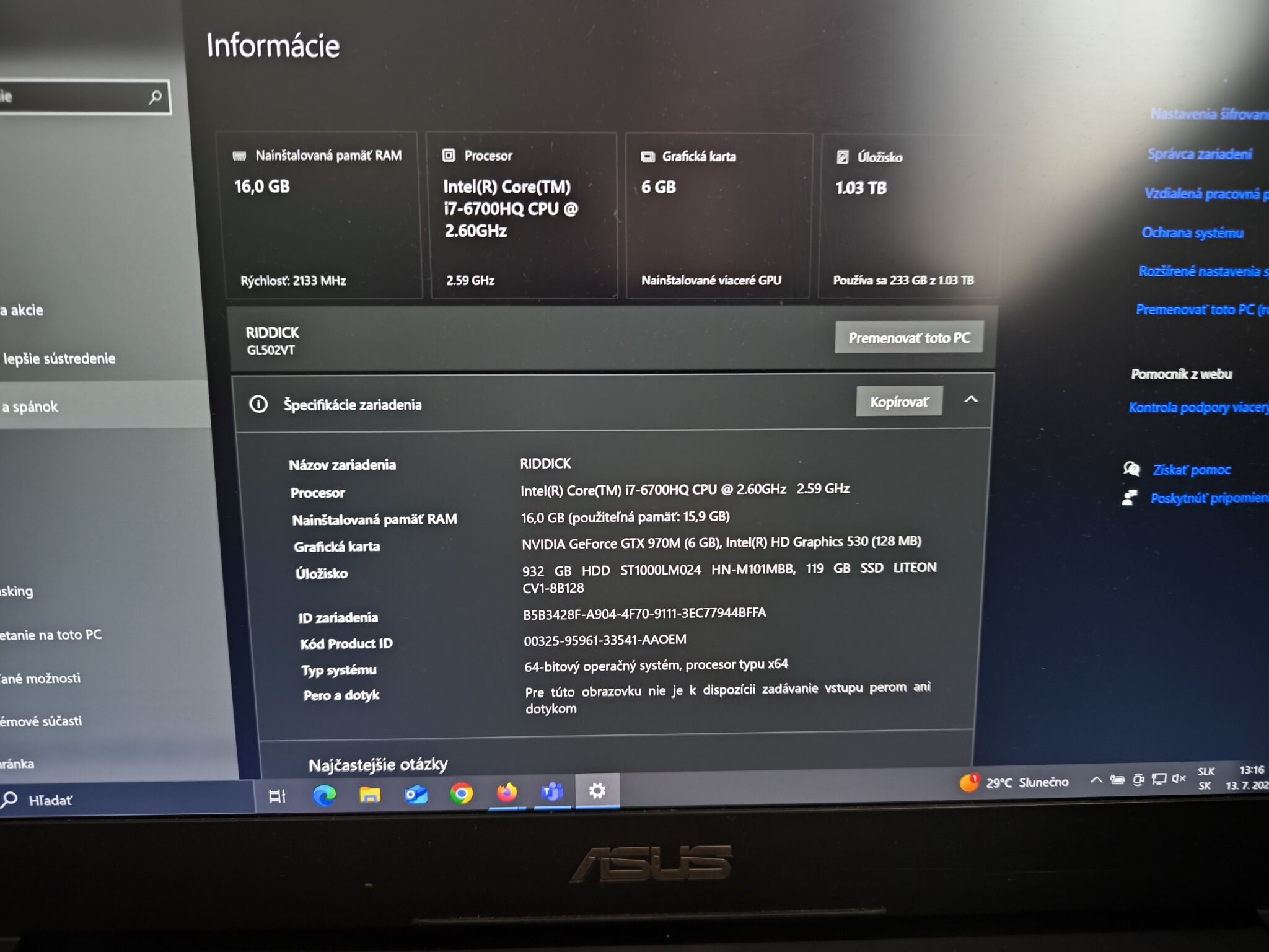 Predám notebook ASUS ROG GL-502 STRIX Procesor: Inter Core i7-6700HQ 2,6 GHz Pamat: 16 GB SSD: 128 GB + 1 TB HDD Grafika: NVIDIA GeForce GTX 970 M + Intel HD Graphics 530 ( 128 MB ) WIN 10 . Cena: 330 E